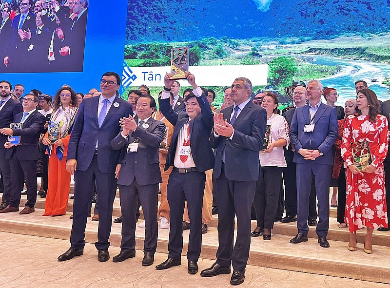 | Chủ tịch UBND xã Tân Hóa nhận Giải thưởng “Làng du lịch tốt nhất” của UNWTO với sự chúc mừng của Phó Cục trưởng Hà Văn Siêu và Tổng Thư ký UNWTO Zurab Pololikashvili. (Ảnh: VNAT) |
