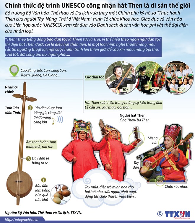 Trước đó, vào cuối tháng 3/2017, Bộ trưởng Bộ Văn hóa, Thể thao và Du lịch đã thay mặt Chính phủ ký hồ sơ “Thực hành Then của người Tày, Nùng, Thái ở Việt Nam” trình Tổ chức Khoa học, Giáo dục và Văn hóa của Liên hợp quốc (UNESCO) xem xét đưa vào Danh sách di sản văn hóa phi vật thể đại diện của nhân loại.