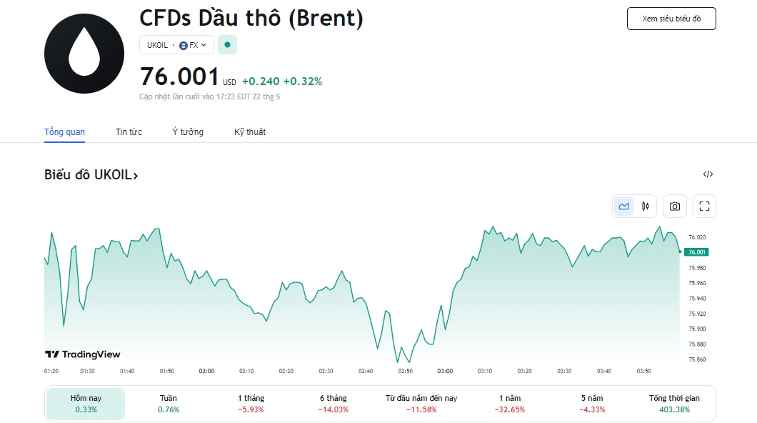 | Giá dầu Brent lên mức 76,00 USD/thùng. Ảnh: chụp màn hình |
