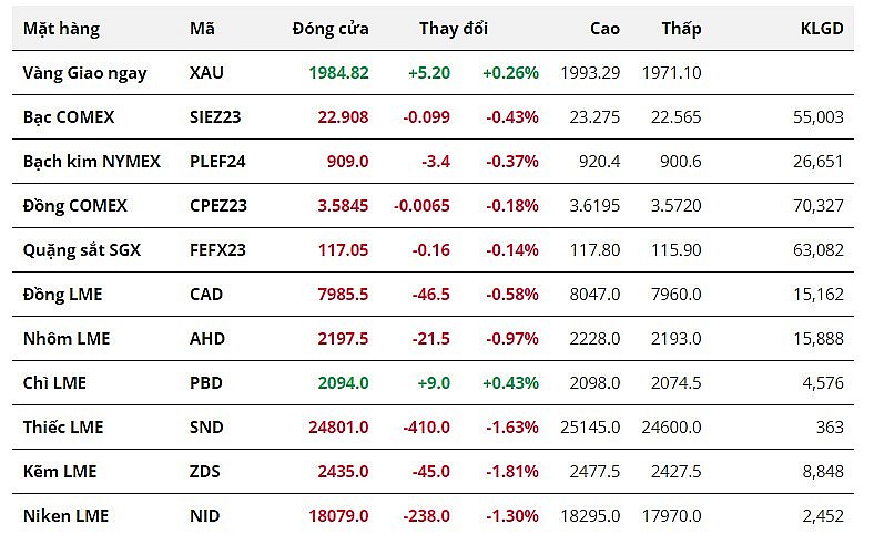 Trái lại, giá vàng tăng 0,26% lên 1.984,82 USD/ounce. Đối với nhóm kim loại cơ bản, giá đồng COMEX giảm 0,18% xuống 3,58 USD/pound trong khi giá quặng sắt giảm xuống 117,05 USD/tấn sau khi để mất 0,14%.