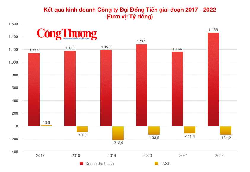 Hơn thế, các năm 2019 - 2022, doanh thu tiếp tục đạt trên 1.000 tỷ đồng, lần lượt là 1.193 tỷ đồng, 1.283 tỷ đồng, 1.164 tỷ đồng và 1.466 tỷ đồng; đổi lại, Đại Đồng Tiến vẫn chưa tìm thấy "phao cứu sinh", các khoản lỗ ròng tuy có giảm nhưng tương ứng nhận về là 213,9 tỷ đồng, 133,6 tỷ đồng, 111,4 tỷ đồng và 131,2 tỷ đồng (2019 - 2022).