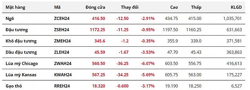 Kết tuần 12 - 18/2, toàn bộ nhóm nông sản đều ghi nhận giảm giá, trong bối cảnh những dự báo đầu tiên về mùa vụ năm nay tại Mỹ trong hội thảo Ag Outlook 2024 phản triển vọng nguồn cung tích cực. Lúa mì là mặt hàng dẫn đầu đà giảm của cả nhóm, đánh dấu tuần suy yếu thứ 3 liên tiếp.
