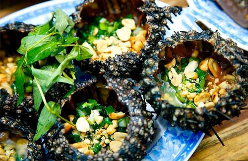 Đỉa biển, dưa chuột biển là tên gọi khác của hải sâm. Có vị mặn, bổ âm, bổ thận, dưỡng huyết, ích tinh, chống mệt mỏi, phòng chống khối u… nên hải sâm được coi là một nguyên liệu quý và cao cấp. Người ta chế biến hải sâm thành cháo, súp, canh hầm hoặc om đều thơm ngon. Ảnh: Kim Chi