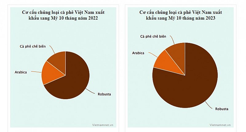 Về cơ cấu chủng loại, nước ta đang xuất khẩu cà phê Robusta, Arabica và cà phê chế biến sang thị trường Mỹ. Trong đó, tỷ trọng xuất khẩu cà phê Robusta chiếm 79% tổng kim ngạch trong 10 tháng năm 2023, cao hơn mức 68,4% cùng kỳ năm ngoái.