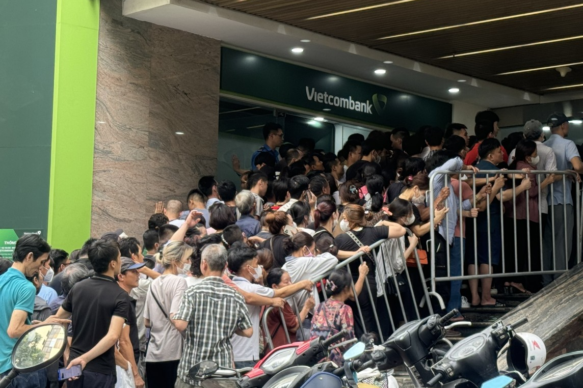 Theo ghi nhận, sáng 11/6, tại nhiều điểm bán vàng thuộc các Ngân hàng thương mại như tại chi nhánh Vietcombank ở Láng Hạ, Đống Đa, hay tại chi nhánh Agribank Trần Đăng Ninh, Cầu Giấy, Hà Nội đều xảy ra tình trạng "tắc nghẽn" vì người đến xếp hàng mua vàng quá đông.