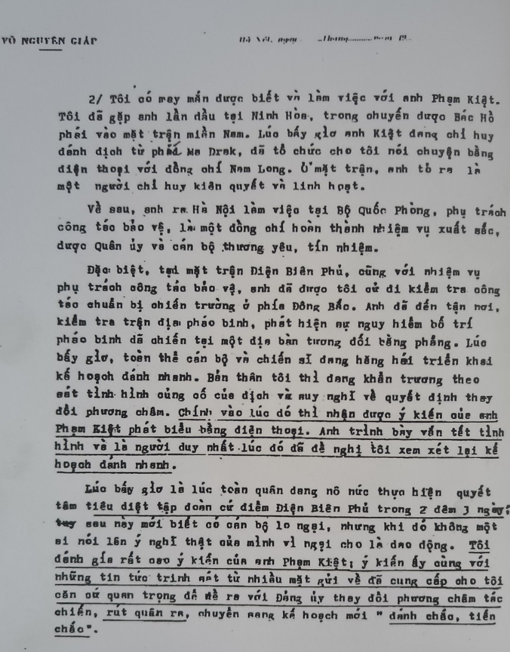 Hơn 50 năm sau chiến dịch Điện Biên Phủ, trong bức thư gửi Hội Khoa học lịch sử Việt Nam ngày 19/1/1995, Đại tướng Võ Nguyên Giáp đã có những đánh giá về đề xuất của ông Phạm Kiệt, người đồng chí, đồng đội đã mất tháng 1/1975, chỉ mấy tháng trước ngày giải phóng miền Nam, thống nhất đất nước. Đó cũng là sự nghiệp cả cuộc đời của Trung tướng Phạm Kiệt.
