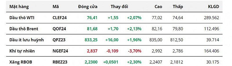 Chốt phiên, giá dầu WTI tăng 2,07%, đạt mức 76,41 USD. Dầu Brent tăng 2,13% lên mức 81,68 USD/thùng.