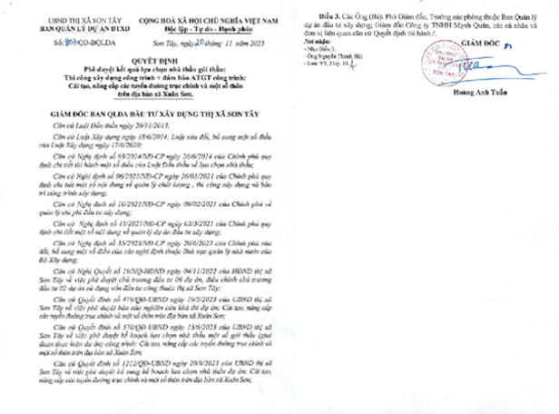 Hạ tuần tháng 11, Ban Quản lý dự án đầu tư xây dựng thị xã Sơn Tây (Hà Nội) với tư cách là chủ đầu tư, trực tiếp mời thầu đã hoàn tất công đoạn chấm thầu, công bố Quyết định số 807/QĐ-BQLDA phê duyệt kết quả lựa chọn nhà thầu cho gói thầu: Thi công xây dựng công trình và đảm bảo an toàn giao thông công trình cải tạo, nâng cấp các tuyến đường trục chính và một số thôn trên địa bàn xã Xuân Sơn, do Giám đốc Hoàng Anh Tuấn ký ban hành.