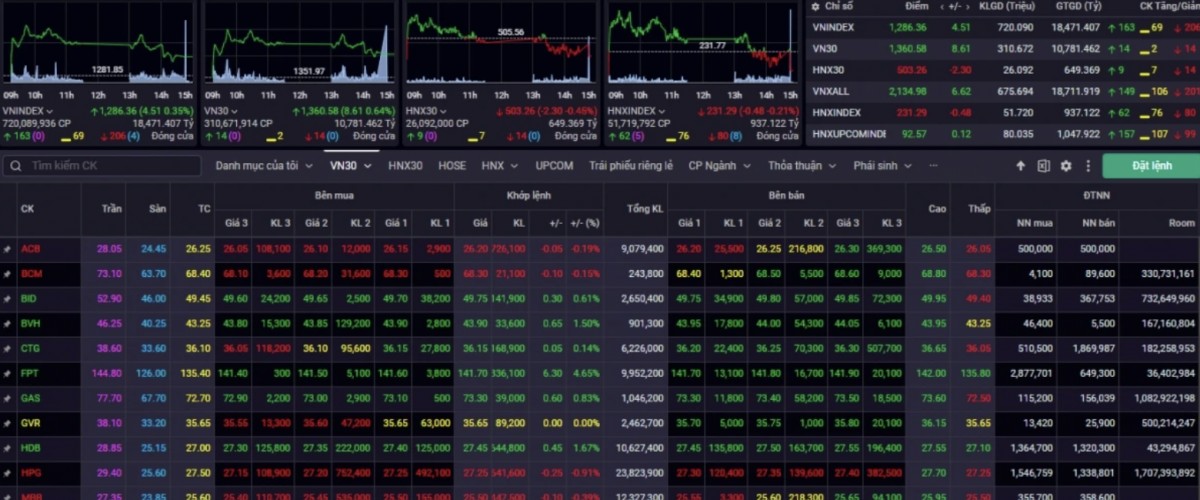 Đóng cửa phiên giao dịch ngày 10/10, VN-Index tăng nhẹ +4,51 điểm (+0,35%) tại mốc 1.286,36 điểm. Tại sàn Hà Nội, HNX-Index kết phiên tại mốc 231,29 điểm (-0,48 điểm, tương ứng -0,21%). Tại sàn Thành phố Hồ Chí Minh, chỉ số VN-Index đóng cửa tăng 4,51 điểm (+0,35%) và lên mức 1.286,36 điểm