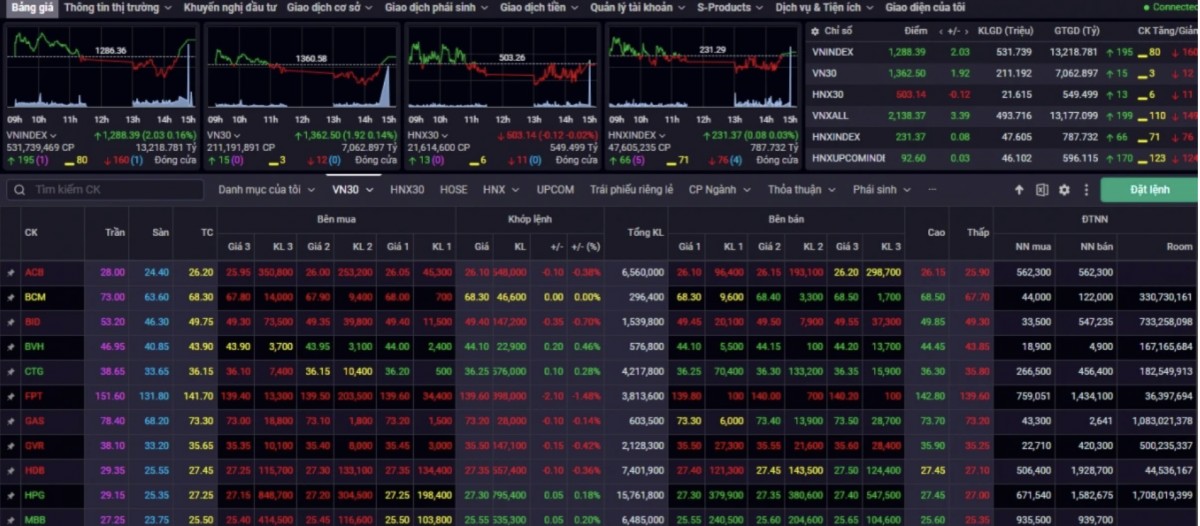 | VN-Index đóng cửa ở mức 1.288,39 điểm +17,79 điểm. Ảnh chụp màn hình |
