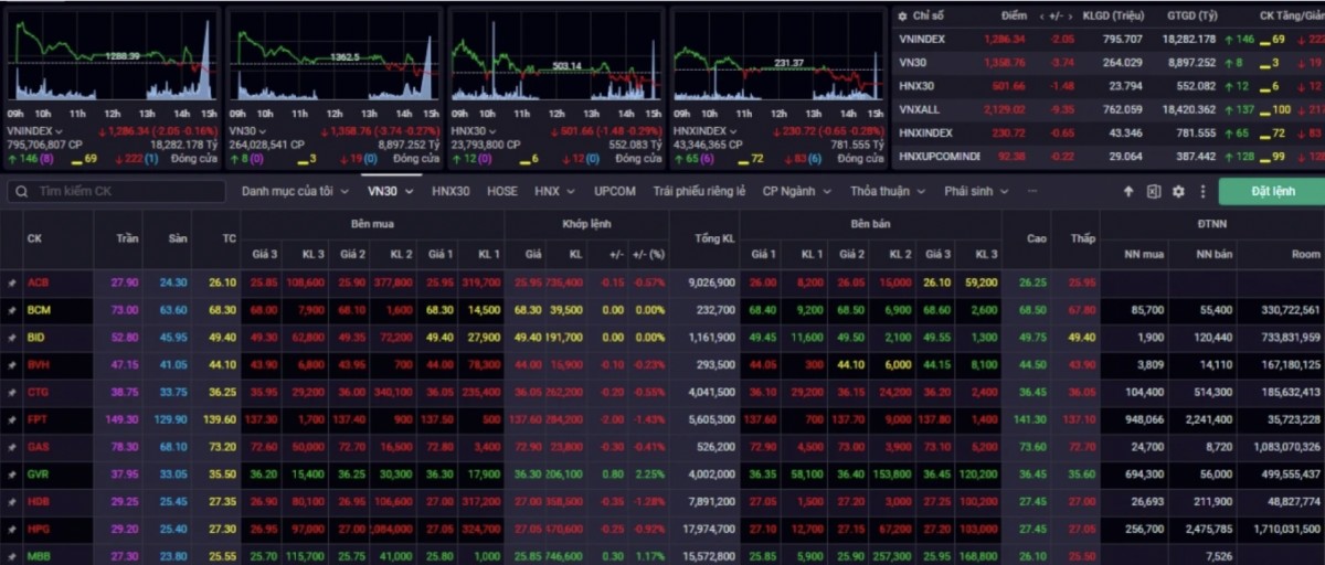 | Kết phiên 14/10, VN-Index quay đầu giảm -2,05 điểm (-0,16%) về mốc 1.286,34 điểm. Ảnh chụp màn hình |