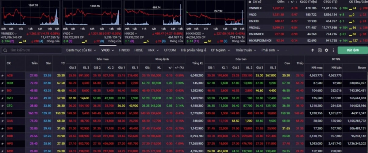 | Đóng cửa tuần giao dịch từ 9-13/12, chỉ số VN-Index đóng cửa ở mức 1.262,57 điểm, - 4,78 điểm. Ảnh chụp màn hình |