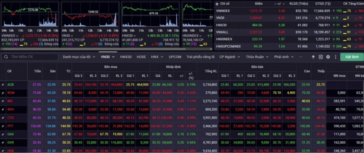 | Kết phiên giao dịch ngày 17/2, VN-Index giảm -3,36 điểm (-0,26%) về mức 1.272 điểm. Ảnh chụp màn hình |