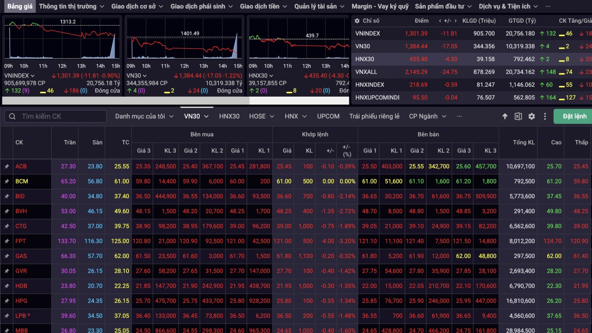 Kết thúc phiên giao dịch 16/5, VN-Index giảm 11,81 điểm, về mức 1.301,39 điểm với số cổ phiếu giảm giá chiếm ưu thế với 186 mã giảm, có 46 mã giữ giá tham chiếu và 132 mã tăng giá. Chỉ số VN30 cũng giảm 17,05 điểm, về mức 1.384,44 điểm. Trong rổ VN30, số cổ phiếu giảm giá chiếm ưu thế với 24 mã giảm, 2 mã giữ giá và 4 mã tăng giá.