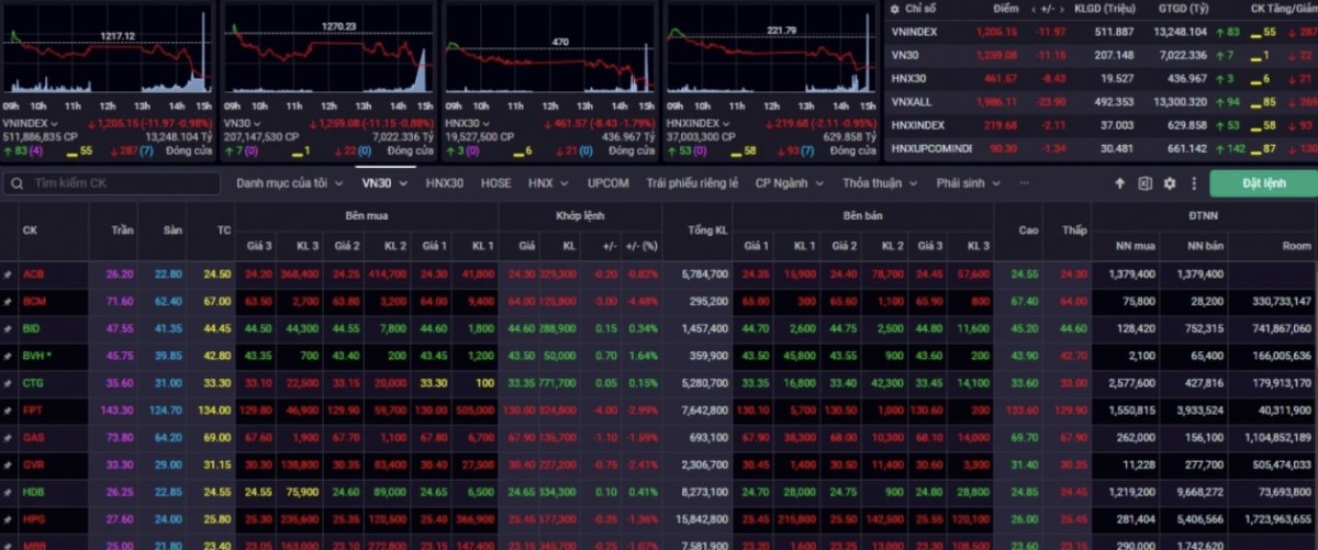 | Kết phiên giao dịch ngày 19/11, VN-Index giảm -11,97 điểm (-0,98%) ở mức 1.205,15 điểm |