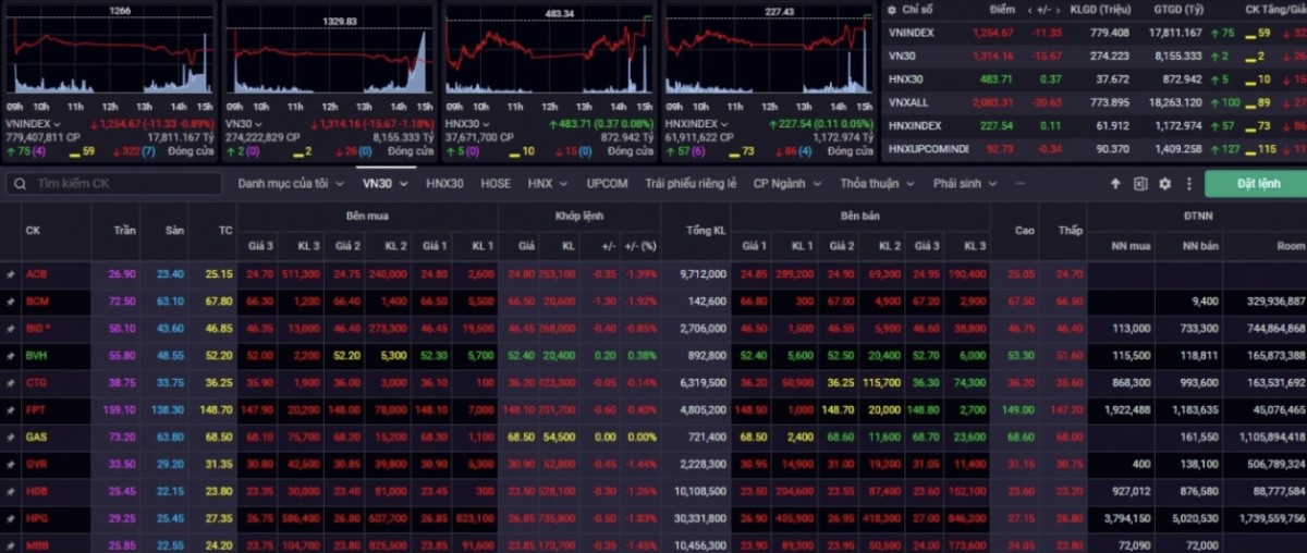 | Kết phiên giao dịch ngày 20/12, VN-Index giảm 11,33 điểm (-0,89%) về mức 1.254 điểm |