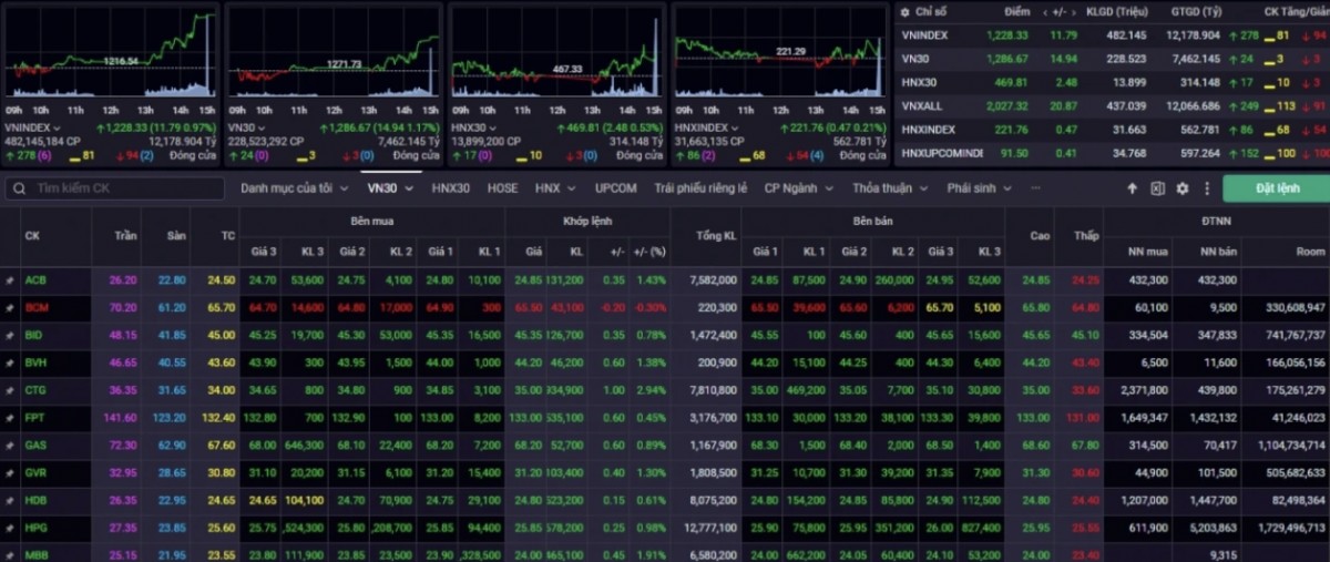 Kết phiên giao dịch ngày 21/11, VN-Index tăng 11,79 điểm (+0,97%) lên mức 1.228,33 điểm. VN30 tăng 1,17% lên mức 1.286,67 điểm, nổ lực vượt lên lại đường giá trung bình 200 phiên quanh 1.290 điểm.