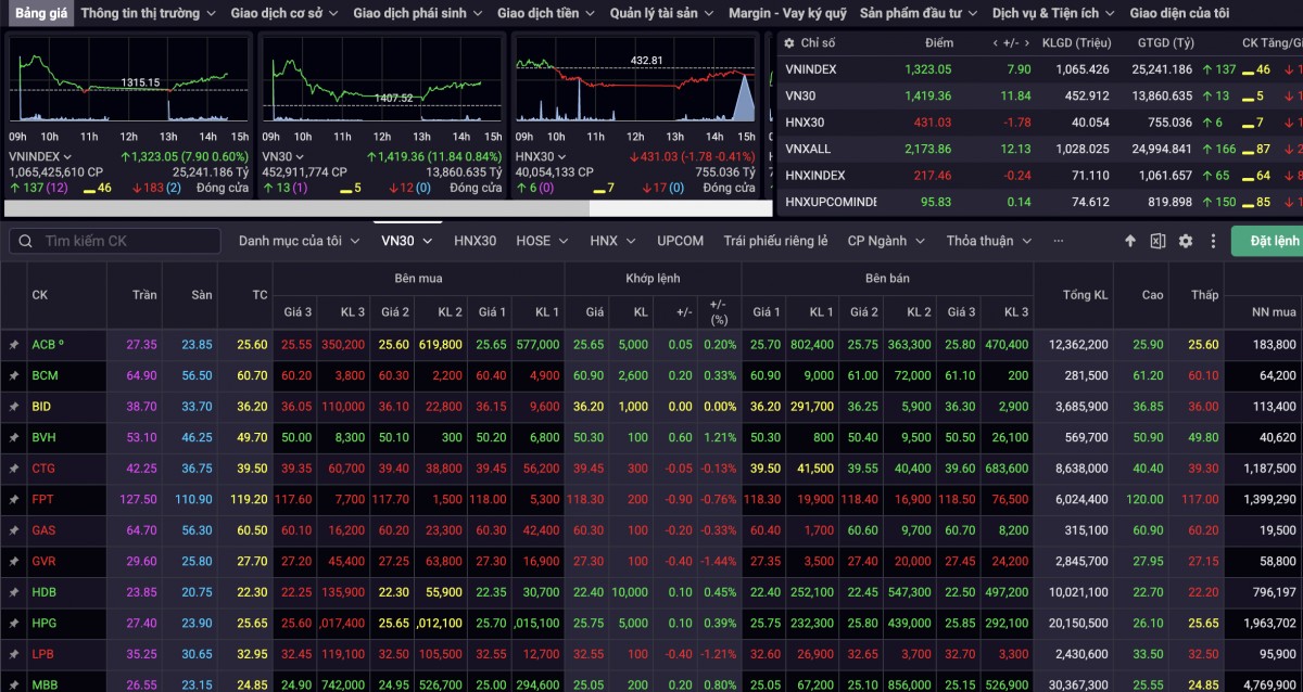 | Kết thúc phiên giao dịch 21/5, VN-Index tăng 7,9 điểm, lên mức 1.323,05 điểm. Ảnh chụp màn hình |