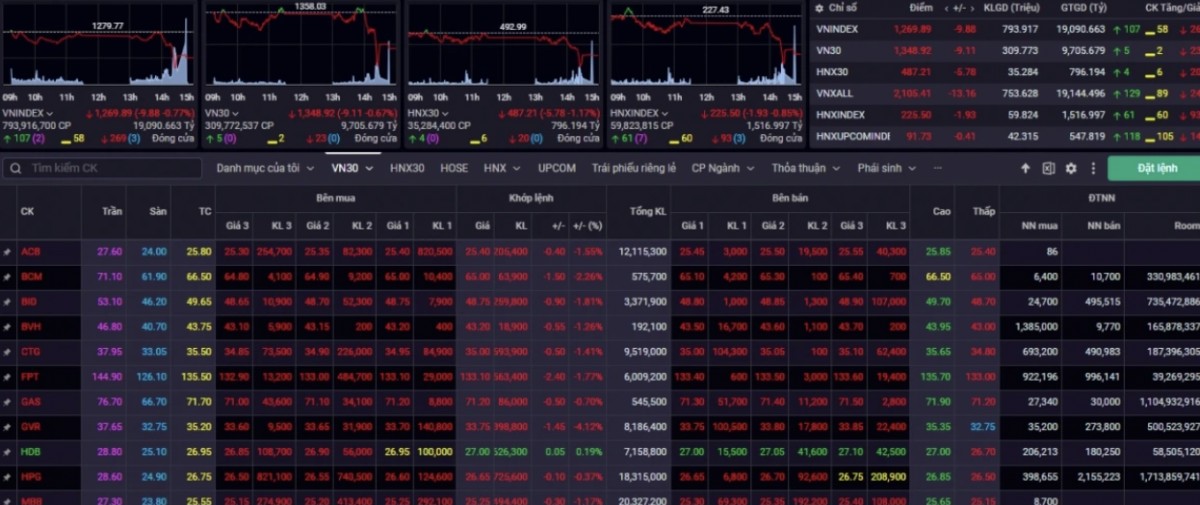 Kết phiên giao dịch ngày 22/10, VN-Index giảm 9,88 điểm về mức 1.269,89 điểm. Độ rộng thị trường nghiêng về bên bán với 213 cổ phiếu giảm giá, 99 cổ phiếu tăng giá, 47 cổ phiếu tham chiếu tại HOSE.