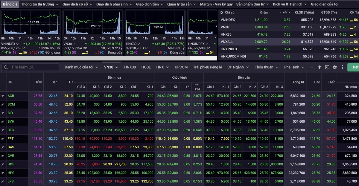 Đóng cửa phiên giao dịch ngày 23/4, VN-Index tăng 13,87 điểm, tiến lên 1.211 điểm. Độ rộng sàn HOSE cũng rất tích cực khi có tới 416 cổ phiếu tăng giá, 56 mã đứng giá và có 120 cổ phiếu giảm giá. Trong khi VN30-Index đóng cửa tăng 12,66 điểm, lên mức 1.303,04 điểm, trong rổ VN30, có 23 mã cổ phiếu tăng giá, 2 mã giữ giá và 5 mã cổ phiếu giảm giá.