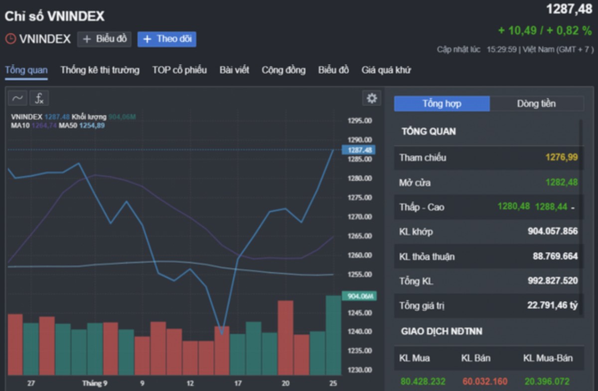 Kết phiên, VN-Index tăng 10,49 điểm, đóng cửa tại 1.287 điểm. Thanh khoản khớp lệnh trên sàn HoSE tăng, với 904,1 triệu cổ phiếu.