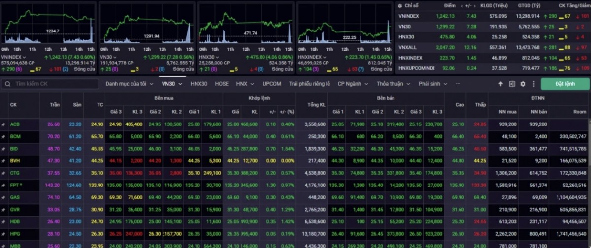 | Kết phiên giao dịch ngày 26/11, VN-Index tăng 7,43 điểm (+0,60%) lên mức 1.242,13 điểm. Ảnh chụp màn hình |