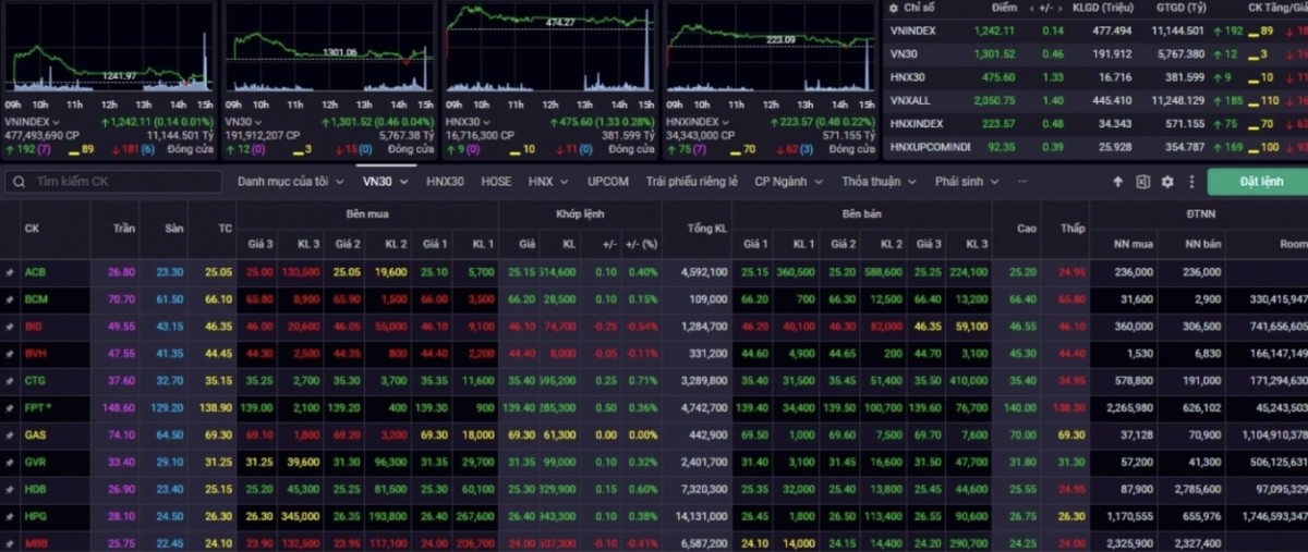 Kết phiên giao dịch ngày 28/11, chỉ số VN-Index đóng cửa tại 1.242, tăng nhẹ 0,1 điểm, tương đương 0,01%, duy trì trên vùng giá trung bình 20 phiên.