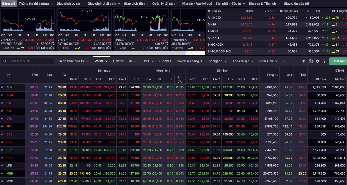 Kết thúc phiên giao dịch 28/4, VN-Index giảm 2,43 điểm, về mức 1.226,8 điểm với số cổ phiếu giảm giá chiếm ưu thế với 262 mã giảm, có 79 mã giữ giá tham chiếu và 235 mã tăng giá. Trong khi VN30 cũng giảm 4,86 điểm, về mức 1.312,32 điểm với số cổ phiếu tăng giá chiếm ưu thế với 15 mã tăng, 2 mã giữ giá và 15 mã giảm giá.