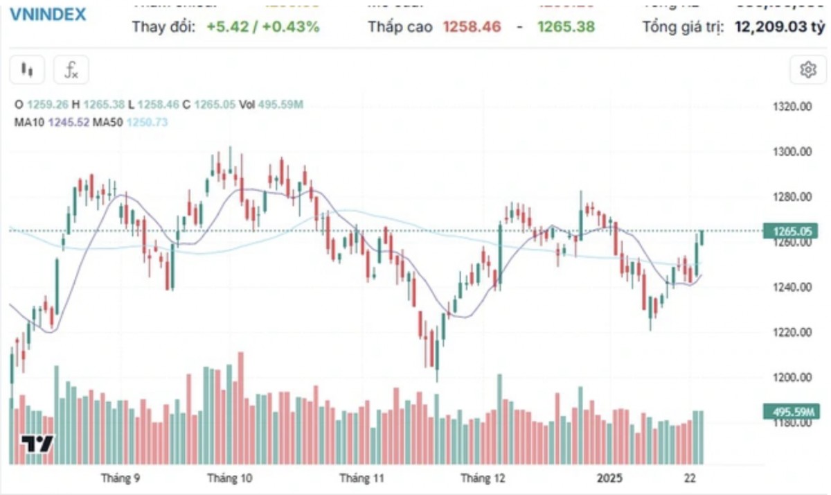 Đóng cửa tuần giao dịch cuối năm, chỉ số VN-Index ở mức 1,265 điểm, tăng 15.94 điểm (+1.28%). Thanh khoản khớp lệnh thị trường có sự khởi sắc tiệm cận 82% so với mức bình quân 20 tuần giao dịch. Lũy kế cả tuần giao dịch, thanh khoản bình quân trên sàn HSX đạt 472 triệu cổ phiếu (+9.98%), tương đương 11,773 tỷ đồng (+7.87%) về giá trị giao dịch.