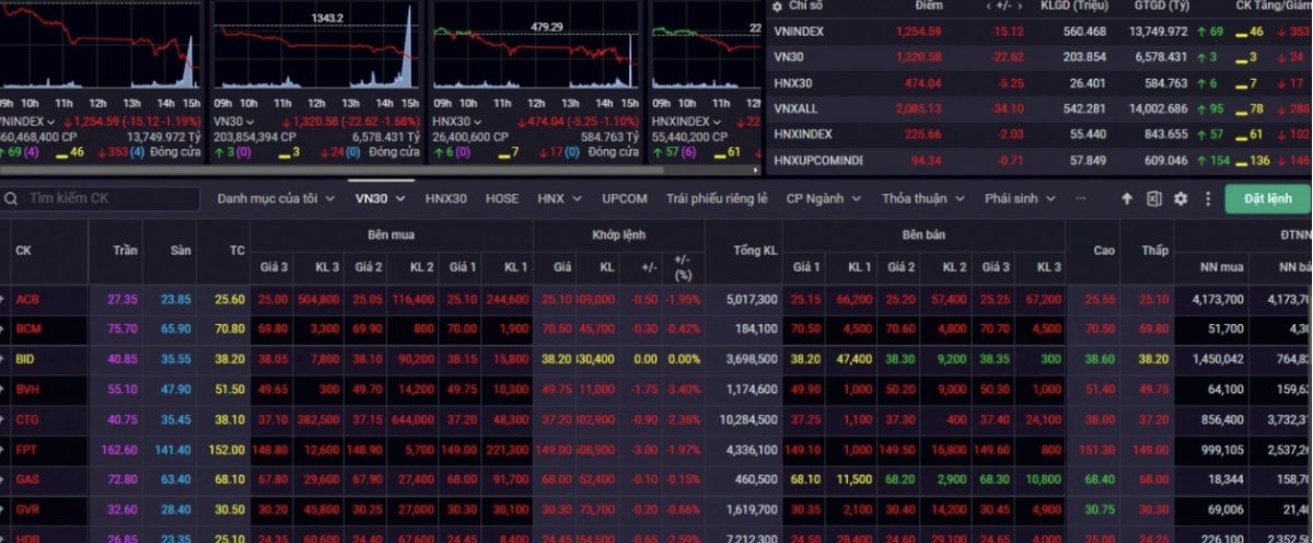 | VN-Index giảm một mạch từ ngưỡng 1.270 xuống ngưỡng 1.255 trong ngày cuối tuần và đóng cửa tại mốc 1.254 điểm. Độ rộng thị trường nghiêng về phía tiêu cực với 16/18 ngành giảm điểm, trong đó cổ phiếu bảo hiểm, bán lẻ, dịch vụ tài chính dẫn đầu đà giảm. |