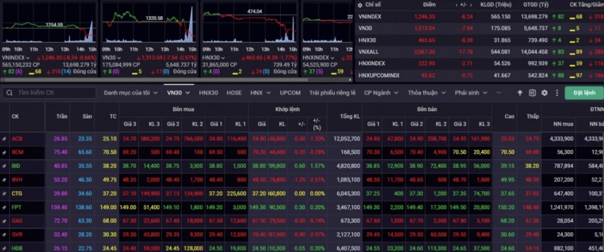 Kết phiên giao dịch ngày 6/1, VN-Index giảm 8,24 điểm (-0,66%) về mức 1.246 điểm. Trong khi VN30 giảm 7,54 điểm (-0,57%) về mức 1.313 điểm, chịu áp lực điều chỉnh về vùng giá quanh 1.300 điểm, tương ứng giá trung bình 200 phiên của VN30.