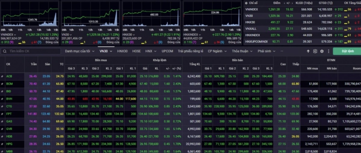 Chốt phiên giao dịch ngày 6/11, VN-Index tăng 15,52 điểm lên 1.261,28 điểm. Ảnh chụp màn hình  |