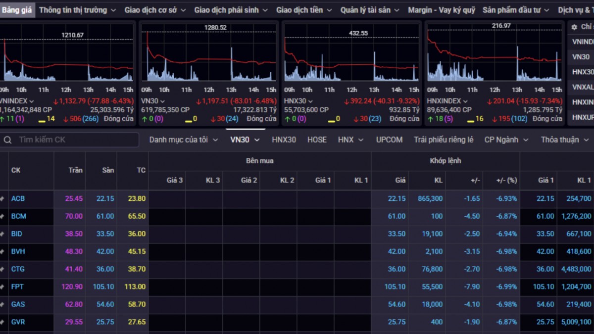 Chỉ số VN30-Index cũng diễn biến tương tự với phiên giảm điểm mạnh. Cụ thể, VVN30-Index giảm 83 điểm (-6,48%), đóng cửa tại 1.197 điểm. Trong nhóm, cả 30 mã đều giảm giá, như BVH (-7%), CTG (-7%), FPT (-7%), GAS (-7%), HDB (-7%).