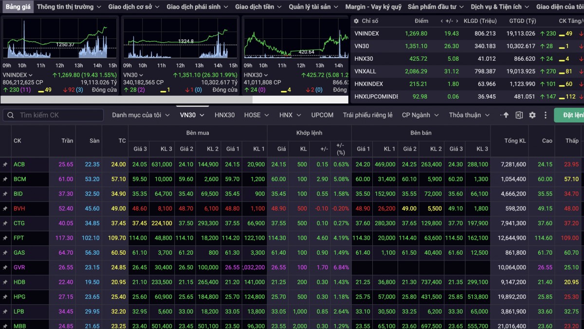 Kết thúc phiên giao dịch 8/5, VN-Index tăng 19,43 điểm, lên mức 1.269,8 điểm. Độ rộng thị trường cũng tích cực khi sắc xanh chiếm ưu thế. Thống kê trên sàn HOSE, hôm nay có 230 mã tăng, có 49 mã giữ giá tham chiếu và 92 mã giảm giá. Trong khi VN30 cũng tăng mạnh 26,30 điểm, lên mức 1.351,1 điểm với 28 mã tăng, 1 mã giữ giá tham chiếu và 1 mã giảm giá.