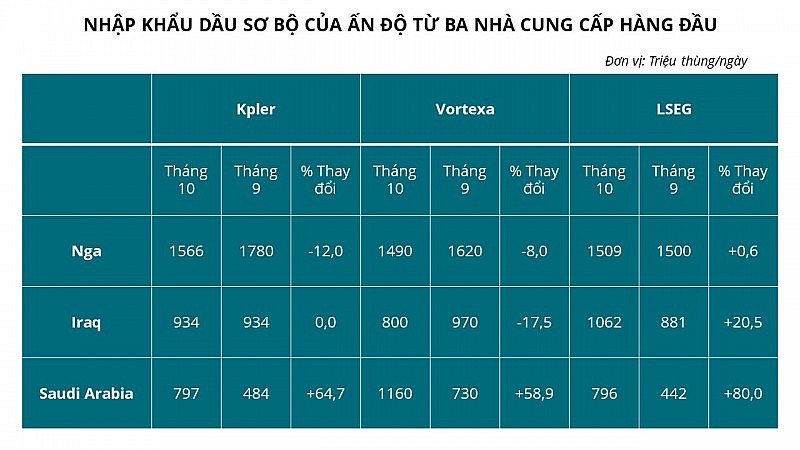 Trong khi đó, dữ liệu từ LSEG cho thấy mức tăng trưởng nhẹ do hãng này đã điều chỉnh giảm lượng dầu nhập khẩu từ Nga vào Ấn Độ trong tháng 9.