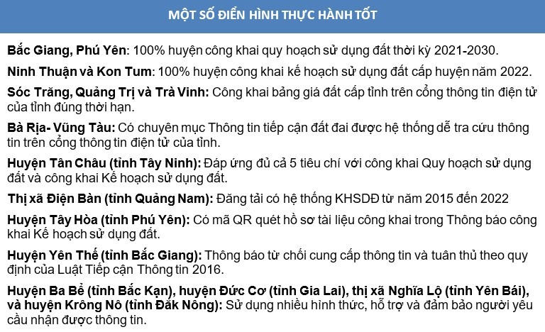 Cùng với đó, việc công khai thông tin quy hoạch sử dụng đất cấp huyện, nội dung mới được đánh giá vào năm 2022, tính đến hết ngày 6/10/2022, trong tổng số 705 đơn vị huyện trên toàn quốc, gần 49% (tương đương 345 Uỷ ban nhân dân cấp huyện) đã thực hiện công khai quy hoạch sử dụng đất cấp huyện thời kỳ 2021-2030, trong đó 105/345 cơ quan được ghi nhận đã công khai đúng thời hạn, 116/345 cơ quan công khai không đúng thời hạn và 124/345 cơ quan không xác định được thời gian công khai.
