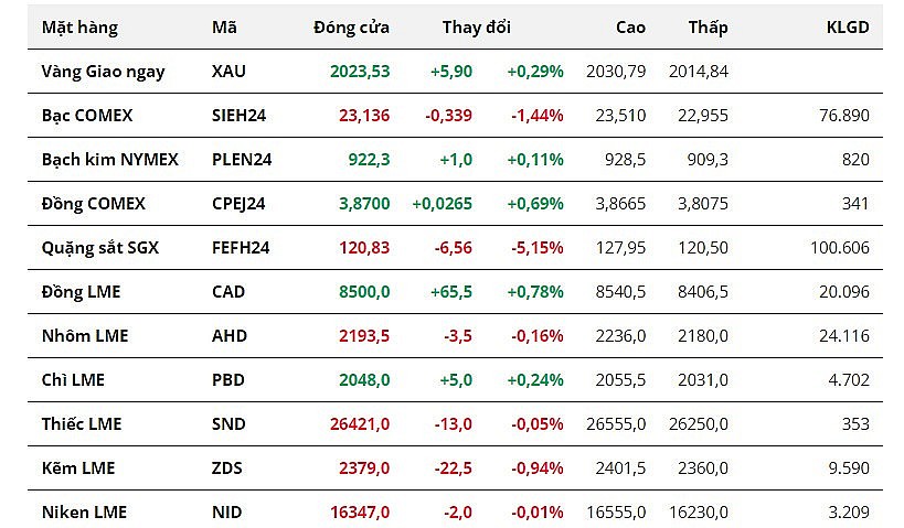 Đối với nhóm kim loại quý, giá bạc giảm 1,44% xuống 23,13 USD/ounce, trong khi đó, bạch kim lấy lại đà tăng giá nhẹ 0,11% lên 922,3 USD/ouce. Kỳ vọng về lãi suất tại các nền kinh tế Mỹ và châu Âu sẽ chưa sớm cắt giảm vẫn là áp lực chính đối với hai mặt hàng này.