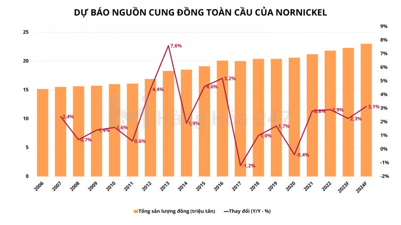 Về nguồn cung, Nornickel dự báo sản lượng mỏ đồng toàn cầu vào năm 2023 và 2024 lần lượt là 22,3 triệu tấn và 23 triệu tấn, do sản lượng tăng ở khu vực Nam Mỹ và Cộng hòa Dân chủ Congo. Ngoài ra, việc mở rộng công suất luyện kim và tinh luyện ở Trung Quốc sẽ thúc đẩy sản lượng đồng tinh chế của thế giới.