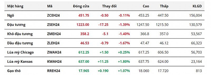 Trong khi đó, giá ngô và lúa mì diễn biến giằng co và đóng cửa với mức thay đổi không đáng kể.