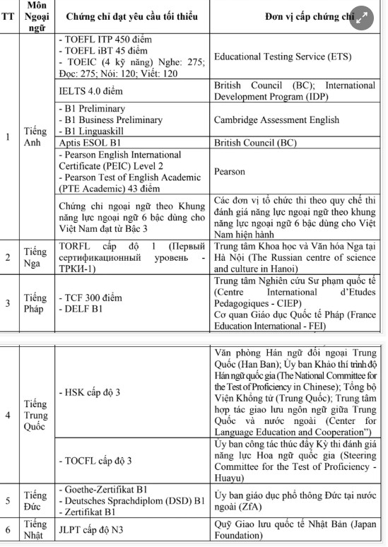 Danh sách các chứng chỉ được miễn thi môn Ngoại ngữ như sau: