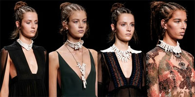 Bộ sưu tập của Valentino là sự cộng hưởng giữa văn hóa bộ tộc của thổ dân châu Phi với vẻ đẹp mơ màng, lãng mạn đậm chất Ý. Nguồn cảm hứng này đã thôi thúc bộ đôi nhà thiết kế Chiuri and Piccioli đưa những chiếc choker mô phỏng ngà voi và vỏ sò độc đáo lên sàn diễn
