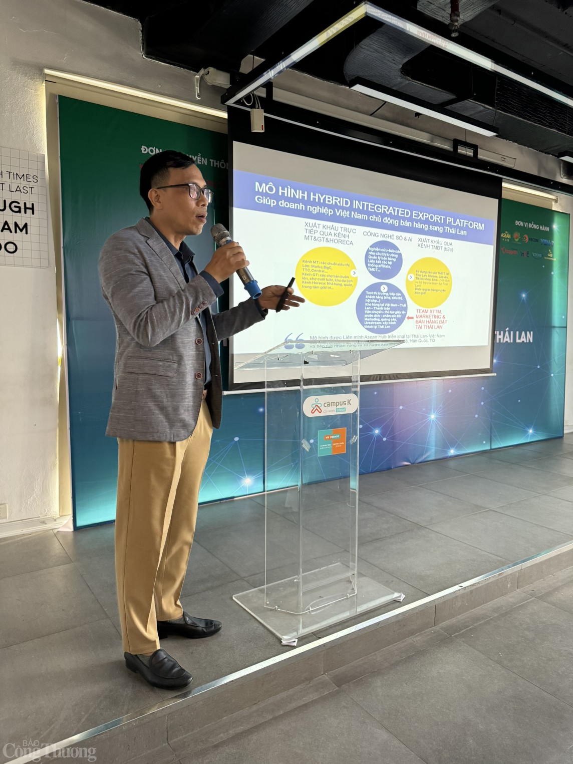 | Ông Trịnh Bá Dương - Chủ tịch liên minh Xúc tiến thương mại ASEAN HUB&YEN-D giới thiệu mô hình Hybird Integrated Export Platform giúp doanh nghiệp Việt chủ động xuất khẩu hàng hoá sang Thái Lan. Ảnh: Phương Cúc |