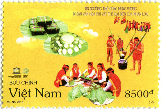Bộ tem “Tín ngưỡng thờ cúng Hùng Vương - Di sản văn hóa phi vật thể đại diện của nhân loại” được thiết kế theo lối tả thực, diễn tả các hình ảnh, hoạt động tiêu biểu về tín ngưỡng thờ cúng Hùng Vương.