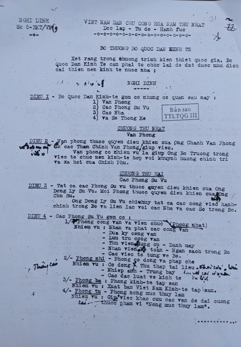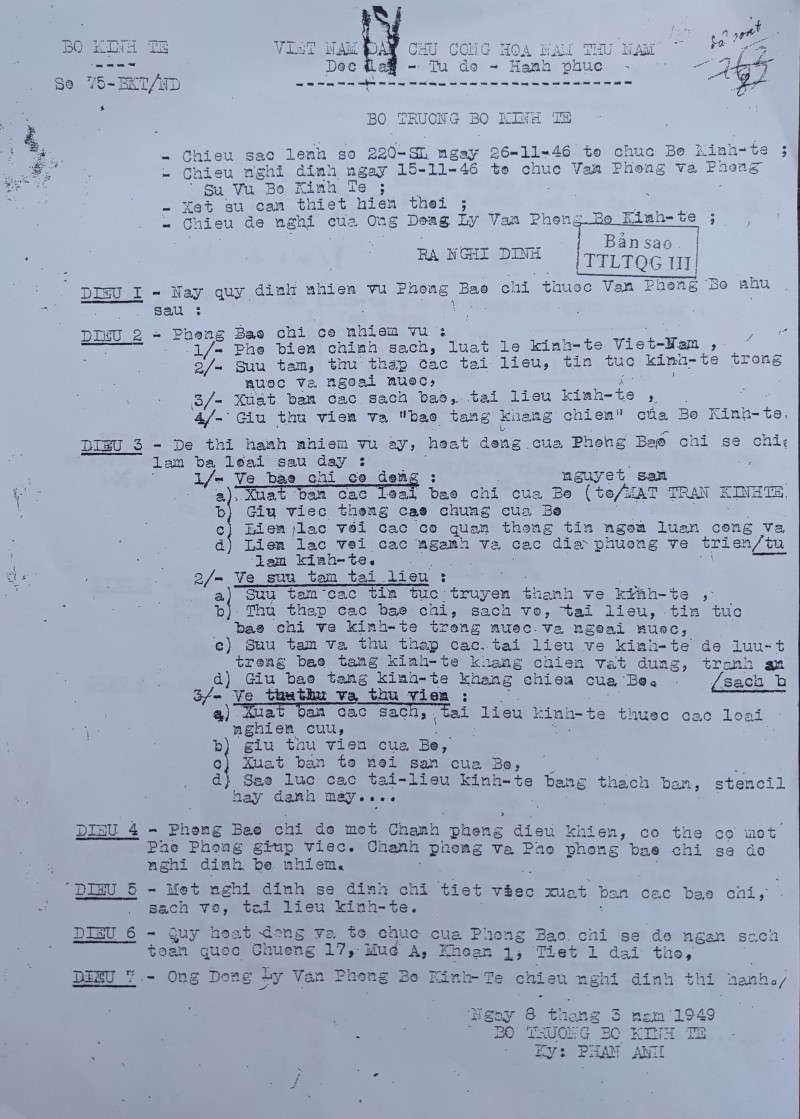 | Nghị định 75-BKT/ND của Bộ Kinh tế ngày 8/3/1949. Tài liệu do Trung tâm Lưu trữ quốc gia III cung cấp |