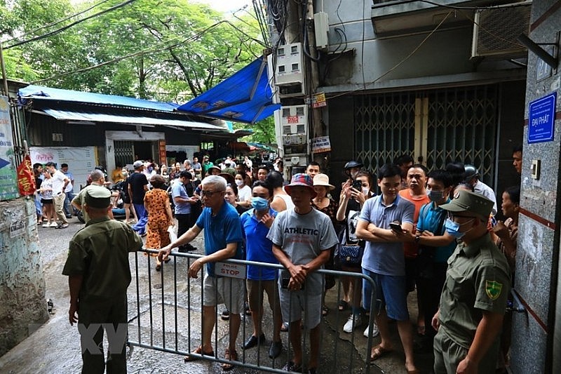 | Lực lượng chức năng quận Thanh Xuân dọn dẹp vệ sinh trước chung cư mi ni xảy ra vụ cháy khiến nhiều người thương vong trên phố Khương Hạ |