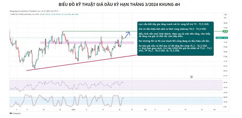 Về mặt kỹ thuật giá dầu, khung 4H, mẫu hình nến doji hình thành, theo sau là một nến tăng, cho thấy đà tăng của giá có thể vẫn sẽ tiếp diễn. Trong khi đó, hai đường %D và %K của Stoch RSI cũng đang có dấu hiệu cắt lên. Dự báo giá dầu có thể duy trì đà tăng lên vùng 76,2 - 76,5 USD.