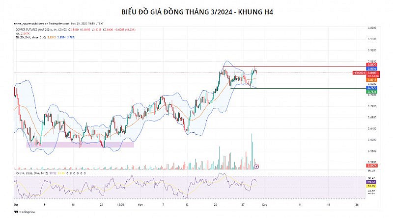 Về mặt kĩ thuật giá đồng, khung H4, sau khi giá tăng chạm mức đỉnh cũ tại 3,86 USD, giá nhanh chóng rút chân và đang có dấu hiệu điều chỉnh giảm. Dự đoán giá có thể giảm về 3,82 USD trước khi tăng trở lại.