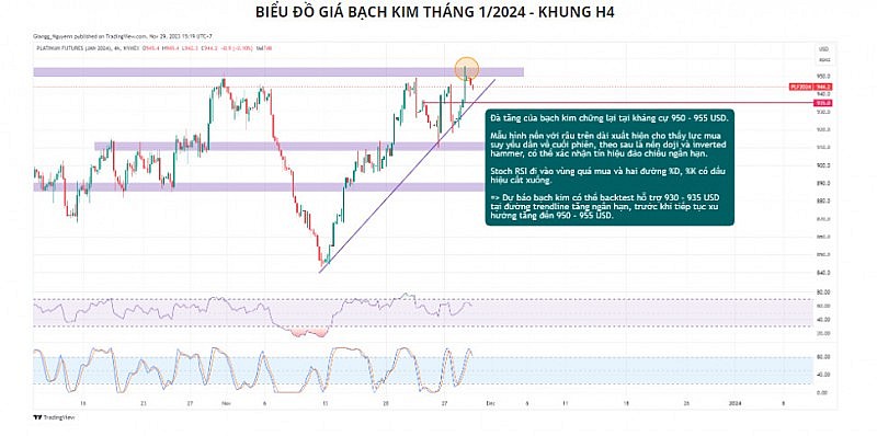 Về mặt kỹ thuật giá bạch kim, khung 4H, giá bạch kim có dấu hiệu hạ nhiệt do áp lực bán gia tăng tại kháng cự 950 - 955 USD, với sự xuất hiện của mẫu hình nến doji và inverted hammer. Dự báo bạch kim có thể backtest hỗ trợ 930 - 935 USD trước khi tiếp tục xu hướng tăng lại đến 950 - 955 USD.