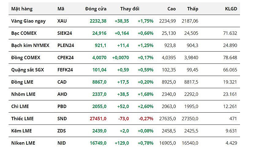 Đối với kim loại quý, giá bạc tăng hai phiên liên tiếp khi tăng 0,66% lên 24,91 USD/ounce. Trong khi đó, giá bạch kim cũng phục hồi 1,25%, đóng cửa tại mức 921,1 USD/ounce. Cả hai mặt hàng đều tăng giá nhờ phát huy tốt vai trò trú ẩn.