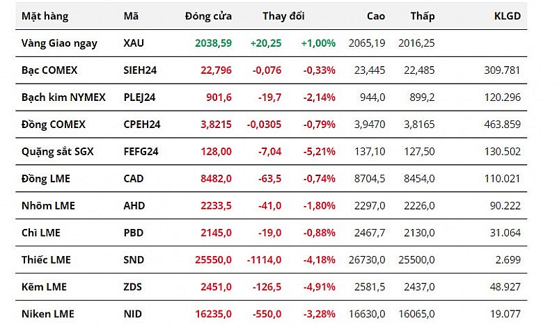 Đối với kim loại cơ bản, giá đồng COMEX giảm 0,79% về 3,82 USD/pound, đứt chuỗi tăng hai tuần liên tiếp. Giá quặng sắt giảm 5,21% về 128 USD/tấn. Đồng USD tăng giá cũng là yếu tố gây sức ép lên nhóm kim loại cơ bản.